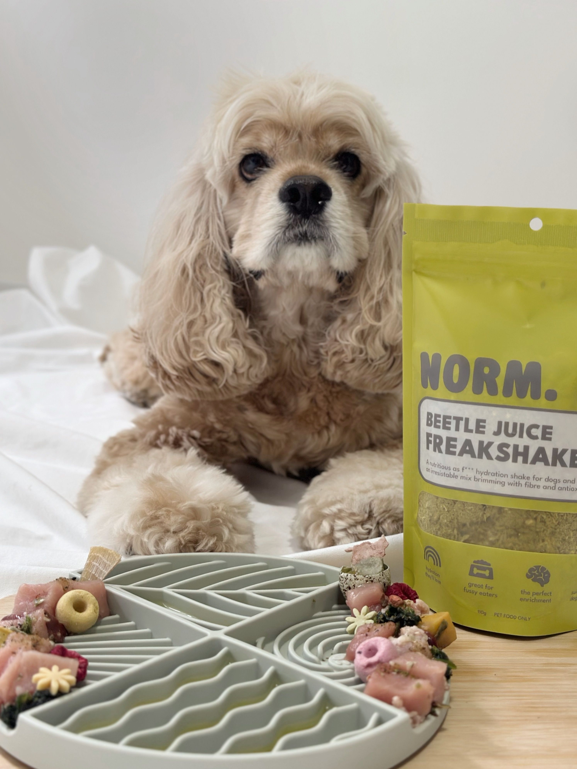 Adding a freakshake to your dog or cat's meals is a great way to entice fussy Normies to eat their dinner. It also increases their water consumption, which is especially helpful for Normies who eat a dry diet (like kibble or freeze dried food), as well as older Normies, or elite athlete Normies. Norm can also be used as a meal topper or a natural food colouring that you can add to things like natural yogurt or homemade dog biccies.