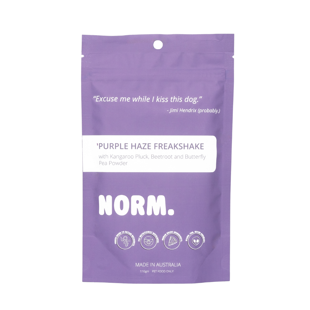 It’s time to get psychedelic with Norm’s Purple Haze freakshake. This powdered milkshake mix is made from freeze dried kangaroo pluck, beetroot, butterfly pea powder and coconut milk. This freakshake is more delicious than a Jimi Hendrix guitar solo and more fun than Woodstock.