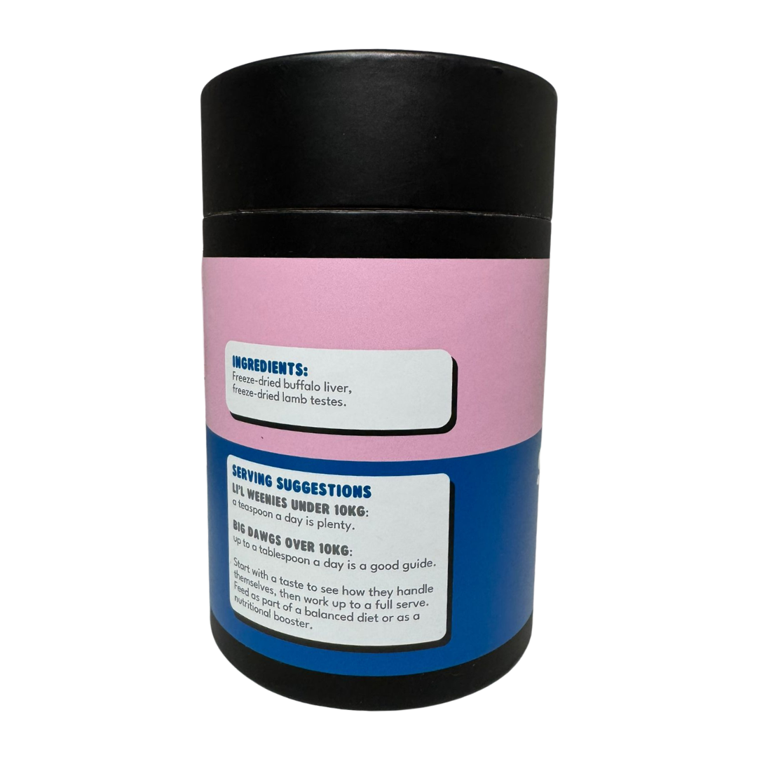 With 50/50 buffalo liver and lamb testes. In DIY raw feeding, it’s recommended that you feed at least 5% liver and 5% one of the other “secreting organs” (kidney, spleen, brain or testes). This topper is designed to replicate this in a shelf stable option.