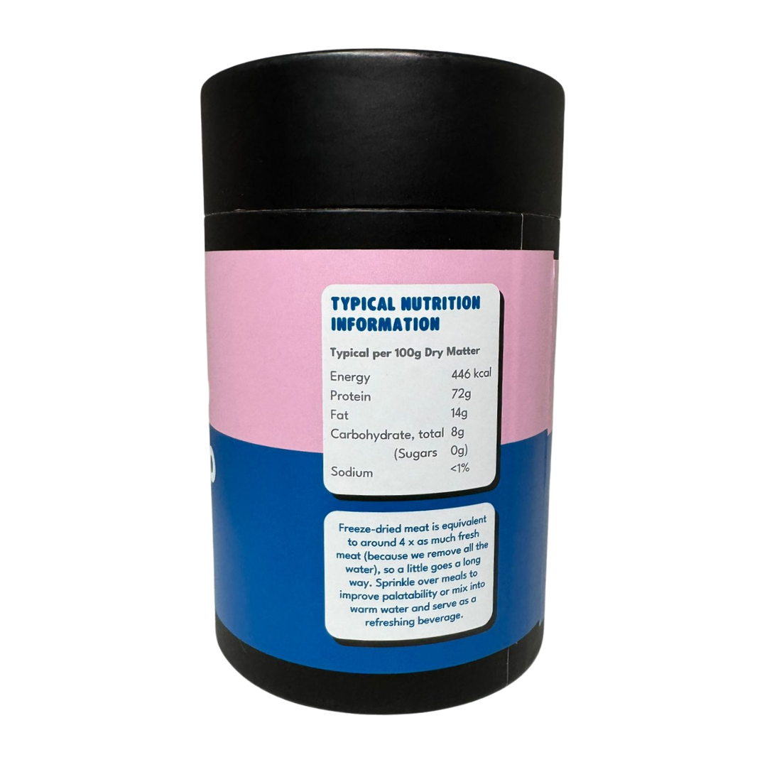 Freeze-dried meat is equivalent to around 4x as much fresh meat (because we remove all the water), so a little goes a long way. Sprinkle over meals to improve palatability, add variety, or in place of fresh organ meat.