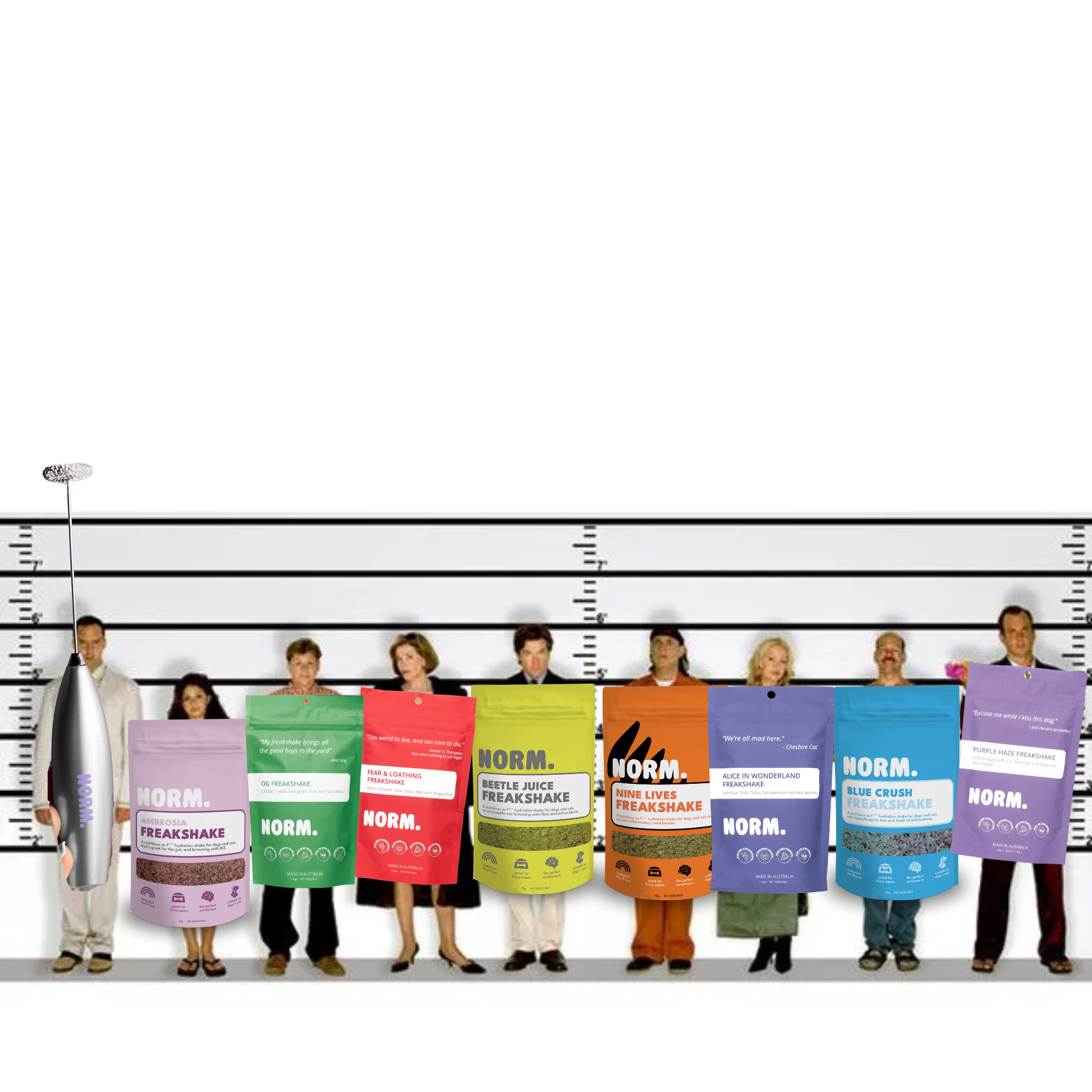Get your freak WELL and truly on with this bundle of Norm's EIGHT current freakshake flavors PLUS a whizzy guy for only an extra ten buckyroos.